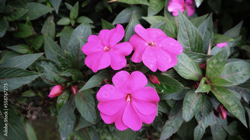 Beautiful sonic amethyst Sunpatien impatient violet flower blooming at the garden.
