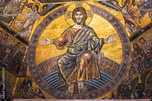 Golden religious mosaic of Jesus decorating wall inside catholic church in Florence