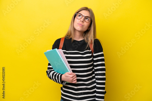 Young student woman isolated on yellow background background and looking up
