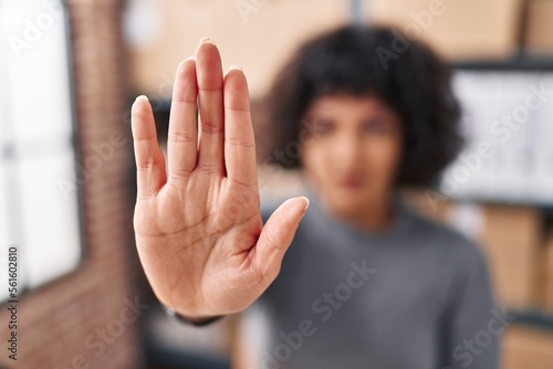 Young beautiful hispanic woman ecommerce business worker doing stop gesture with hand at office