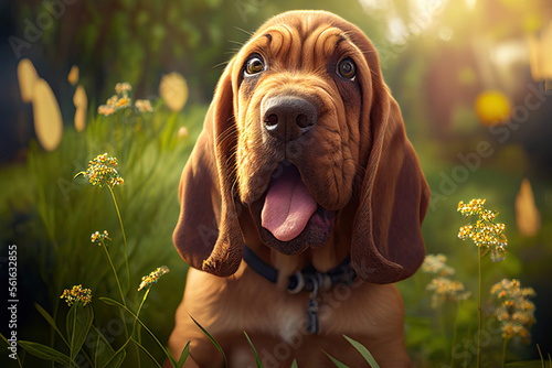 Bloodhound puppy playing in garden, cute dogs, Generative AI