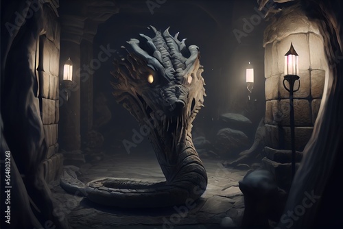 Terrible snake monster with a huge head in the underground catacombs or castle caves. Generative AI