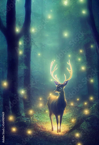 A Mystical Deer with large Antlers Within a Forest with a biol Generative AI Content by Midjourney