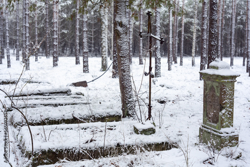 Stary opuszczony cmentarz katolicki zagubiony wśród sosnowego lasu zimą