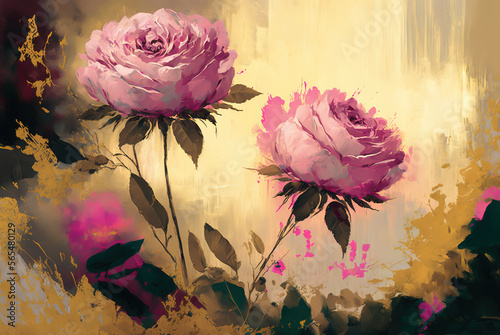 Abstract impressionism style landscape with pink roses and golden brush strokes, Generative Ai