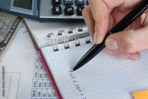 Woman hand with pen on worktable background