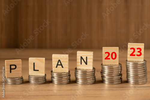 The concept of planning and budget allocation. Wooden cubes with the word "PLAN 2023" on a wooden background, copy space. Use for banner and presentation
