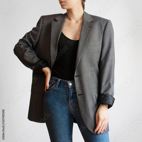 Woman wearing oversized blazer and blue jeans isolated on white background