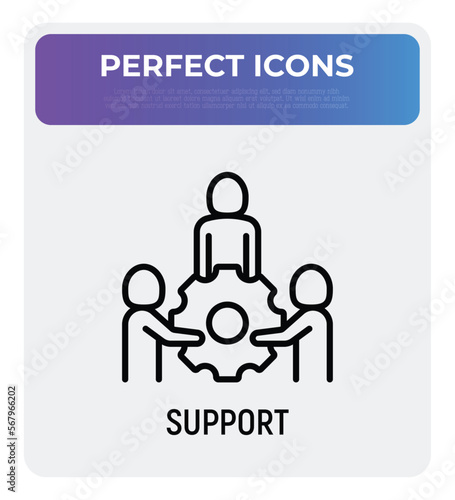 Support thin line icon. Group of people holding big cogwheel by hands. Teamwork, partnership, business cooperation. Modern vector illustration.