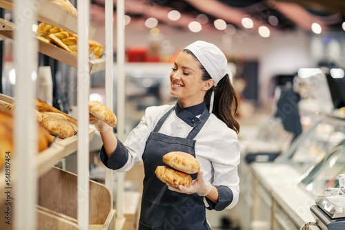 A baker is filling up the shelves with bread while standing at bakery department in supermarket.
