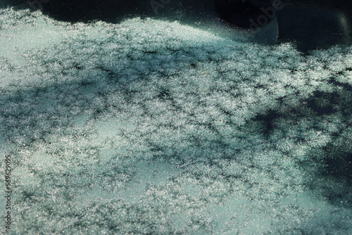 Słoneczny poranek topi lód na szybie samochodu. Wiosna.
