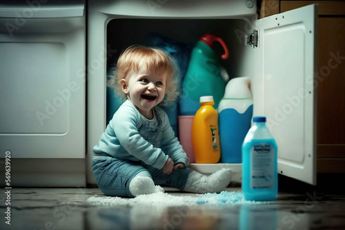 un enfant fouille dans les placards et joue avec des bouteilles de détergent, danger - illustration ia