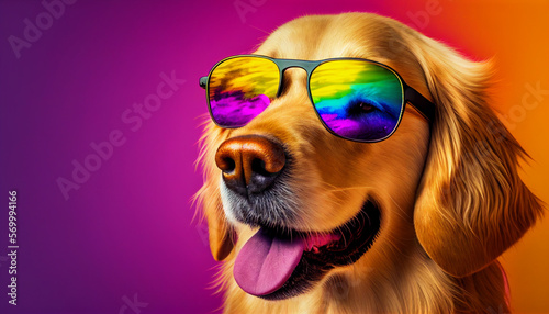 Golden retriever dog wearing sunglasses, happy cute dog wearing sunglasses, colorful background, Generative AI