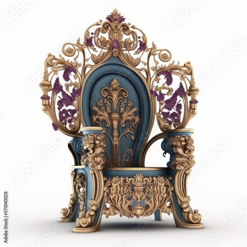 Detailed illustration of an ornate elaborate decorative golden throne for a king, queen or royalty isolated on a white background, generative ai