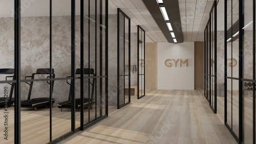 Interior design of a modern contemporary fitness gym corridor with separate rooms.