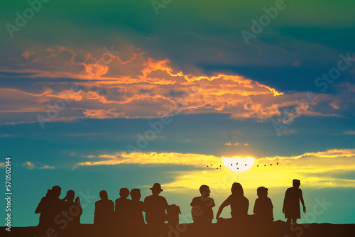 Silhouette people sitting on the floor and sunrise on the colorful sky orange cloud and birds flying