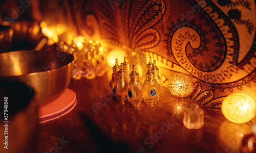 A closeup of perfumes bottles in candlelight and tibetan bowls.