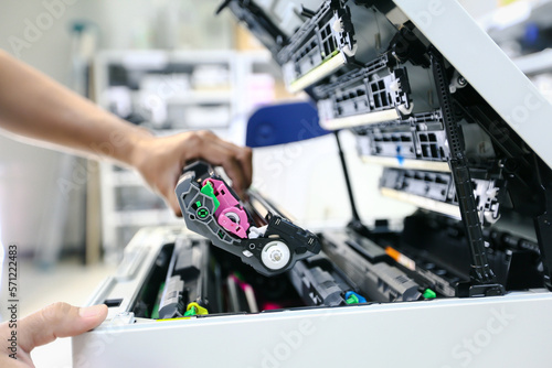 Technician hand open cover printer photocopier or photocopy to replace ink cartridges or fix paper jam for scanning fax or copy document in office workplace.