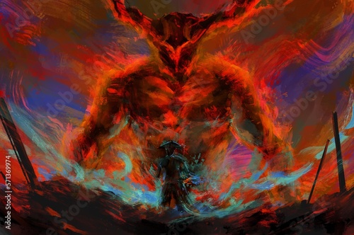 samurai warrior standing confront yokai demon,tale monster,creatures of japanese myth and Legend, god ,digital art, Illustration painting.