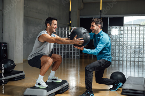 Fitness personal trainer helping man with squatting pose with medicine ball