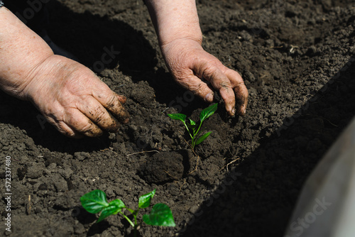 Close-up of hands planting a young seedling in rich garden soil, the image captures the essence of gardening and nurturing life, emphasizing a connection with nature.