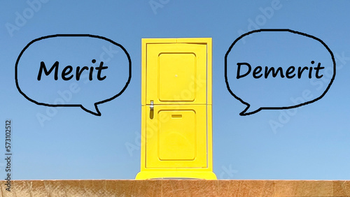 黄色い団地ドア小物とMeritとDemerit文字_青空背景