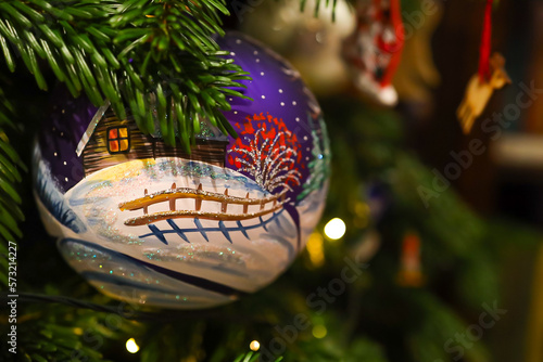 Zimowe symbole Bożego Narodzenia, choinka , bąbki , ozdoby.