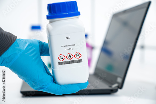 PbS lead(II) sulfide CAS 1314-87-0 chemical substance in white plastic laboratory packaging