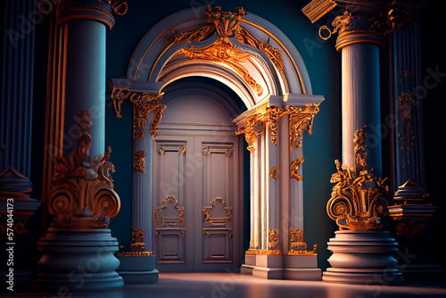 Columns and a golden luxury classic arch. the baroque style portal. The fairy palace's entryway. Generative ai