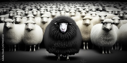 Das schwarze Schaf in der Mitte einer weißen Schafsherde fällt auf. ai generativ