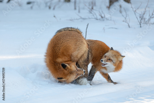 Two (male female Vulpes) Red Foxes seen in mating position while fighting stance during winter season with snow, white background in natural, wild environment.