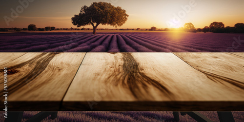 table en bois au premier plan, pour présentation produit, mock-up, arrière plan champs de lavande en provence, effet bokeh