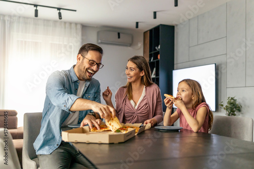 Happy family eating pizza at home