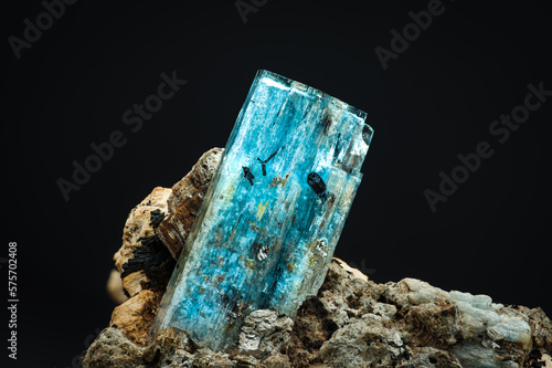 blue aquamarine with schorl (black tourmaline) inclusion. macro detail texture background. close-up raw rough unpolished semi-precious gemstone