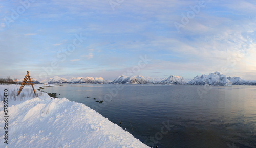 landscape at Lofoten Islands in Norway in winter and sunrise