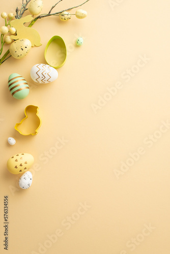 Easter mood concept. Top view vertical photo of colorful easter eggs baking molds and easter plant on isolated pastel beige background with copyspace