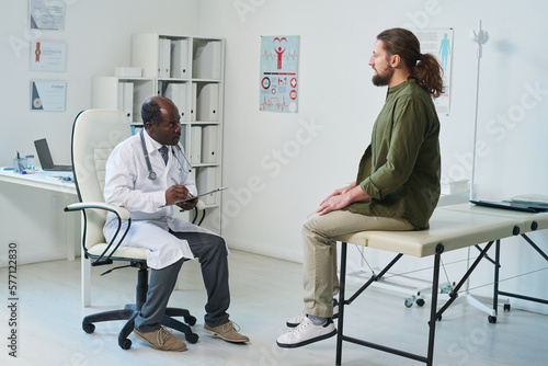 Mature male general practitioner making notes in medical document and looking at young patient sitting on couchette in front of him