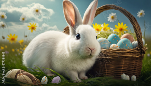 Coelho da Páscoa ao lado de sua cesta de ovos de chocolate criado por IA