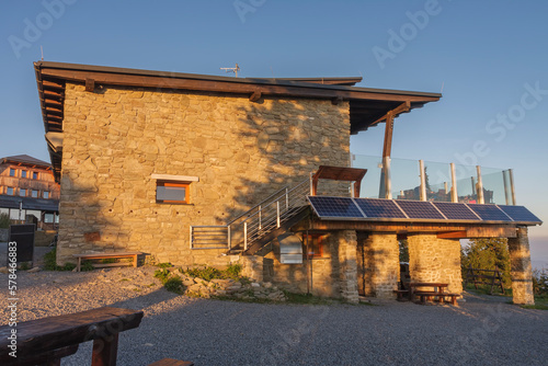 Chalet on Lysa hora, the highest hill of Beskid mountains, Czech republic, sunset time.