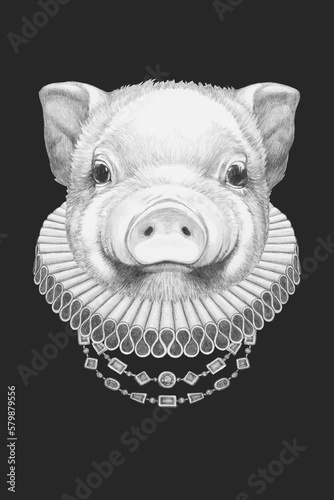 Portrat of Piglet with Elizabethan Collar. Hand-drawn illustration