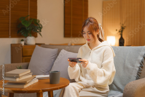 Home lifestyle concept, Young woman playing game on smartphone with excited in night time at winter
