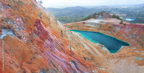 Abandoned copper mines of Cyprus. Colorful gossan (iron cap) of Alestos mine with open pit filled with water, and Memi mine lake at the distance