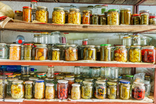 Alte Einmachgläser in einem Ragel im Vorratsraum