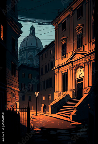 Animation design, night in buildings and streets of Rome, graphic novel style