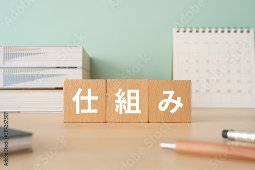 仕組みと書かれたブロックが置かれたデスク