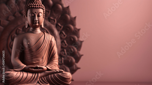 Buddhism background banner with buddha statue and empty space for copy text. Concept of religion and spiritual practice.