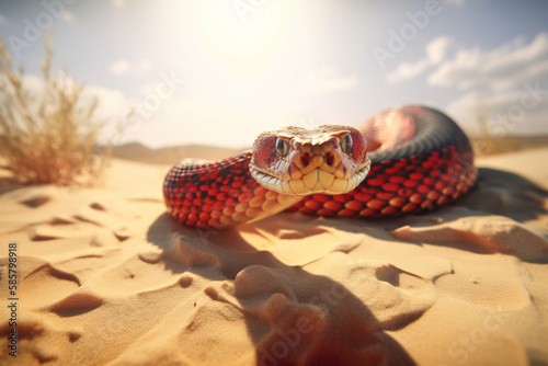Close up front view of red snake ready to charge, Generative aI illustration