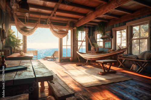 A cozy beach house with a hammock and ocean views