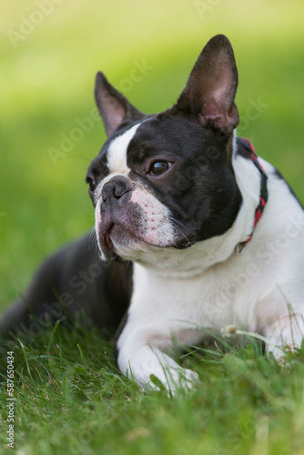 Outdoor head portrait of a purebred Boston Terrier puppy with cute facial expression.