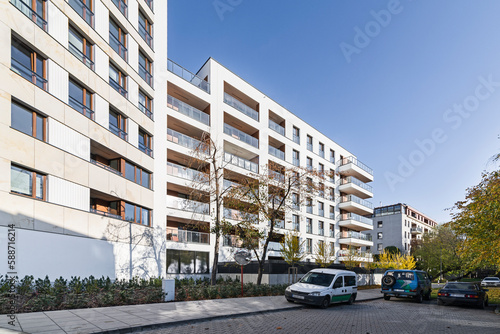 Budynki mieszkalny w europejskim mieście. Nowoczesne bloki. Budynek wielorodzinny w centrum miasta. Duża ilość kondygnacji. Balkony i loggie. Duża ilość zieleni dookoła obiektu.